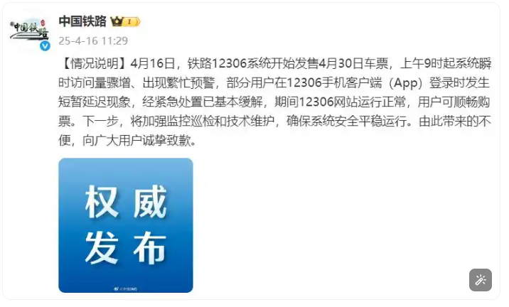 “五一抢票崩了”?4月16日上午,不少网友在社交媒体上表示,今天打算购买4月30日的车票,却发现12306出现正常登录、购票卡顿、订单显示异常等问题。针对用户反映的问题,中国国家铁路集团有限公司及12306客服部门作出官方回应,并同步发布后续购票安排。