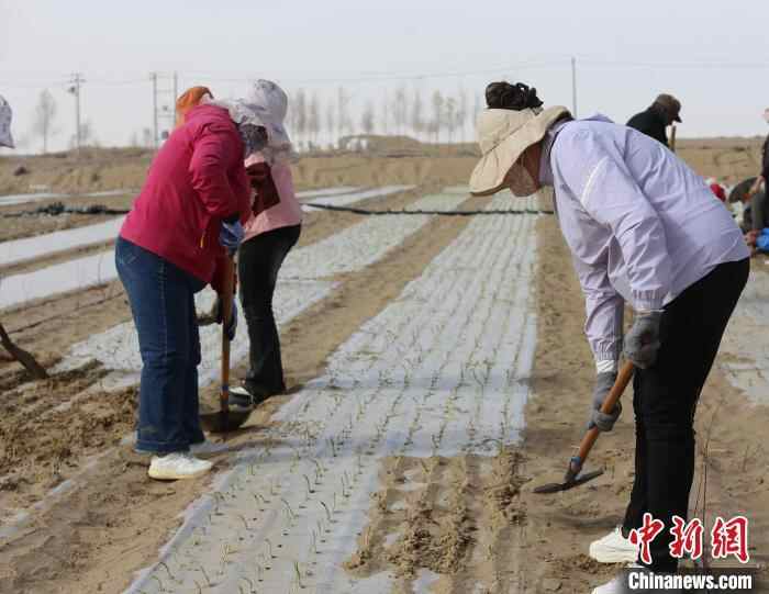近日,和田地区民丰县沙漠实验田,村民正在为洋葱培土。 陶拴科 摄
