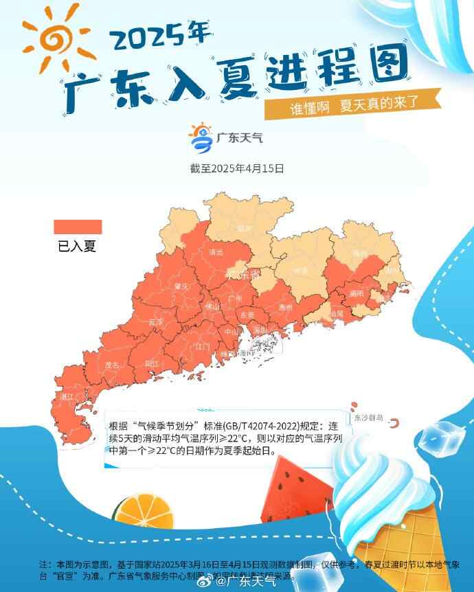 4月16日,广州市气象部门官宣广州已在4月8日进入夏季。根据广东省气象服务中心统计,按照截至4月15日的气象数据,广州、佛山、深圳、东莞、江门、中山、湛江、茂名、云浮、肇庆、珠海、阳江等地已经进入气象学上的夏天;惠州、揭阳、汕头、汕尾、梅州、清远也开始出现气象学上累计入夏日数的过程;韶关、河源和潮州则仍需等待进入夏季的时机。
