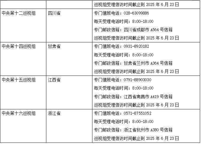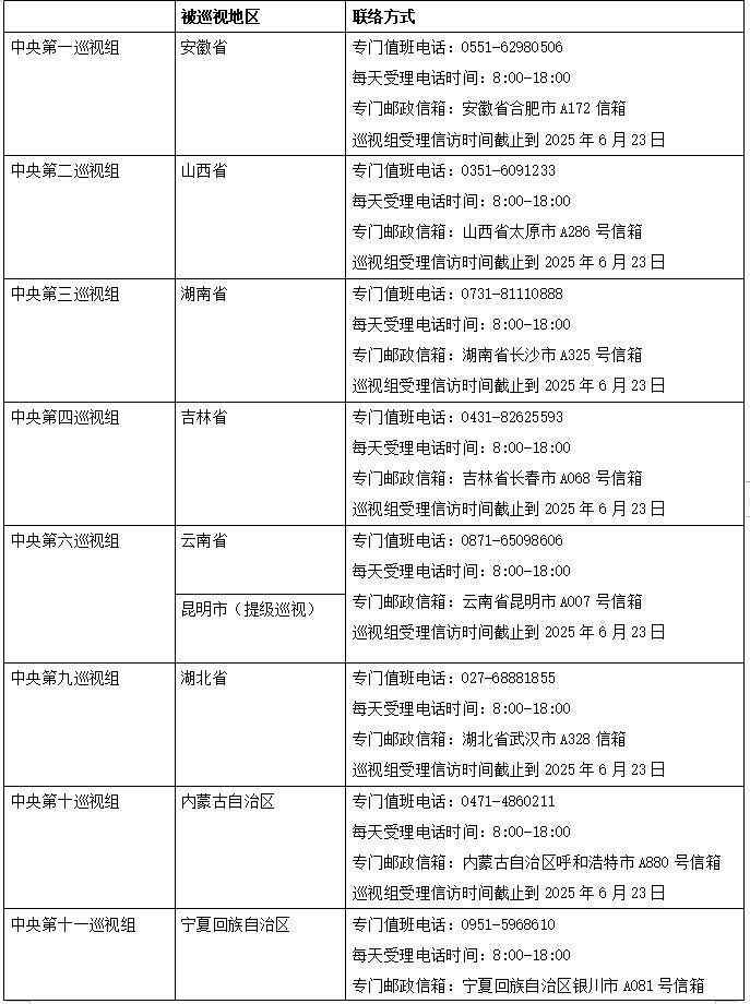 巡视期间,各中央巡视组均设立专门值班电话、专门邮政信箱,受理群众来信来电来访。