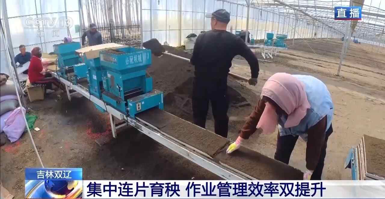 在双辽市双山镇秀水村,农户们正分工协作,进行秧苗铺盘、覆土等育秧工作。在当地,普通农户小规模育秧,大棚的面积大多是两三百平方米,而这座育秧工厂,占地面积达到了4万平方米,能实现集中连片育秧。在使用同款育秧机的前提下,免去了人工来回在多个大棚里转运育秧材料和设备的时间,作业效率可以提升3倍左右。