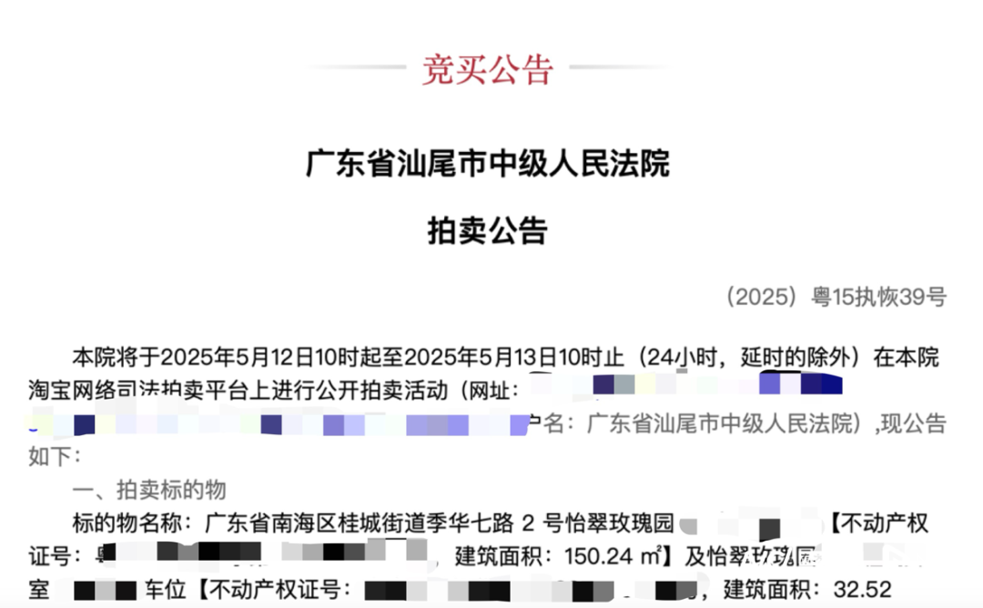 4月11日,广东省汕尾市中级人民法院出具拍卖公告,宣告将于5月12日10时至5月13日10时,拍卖位于佛山市南海区桂城街道季华七路2号怡翠玫瑰园建筑面积为150.24㎡的一栋房产以及该小区地下室一处车位。