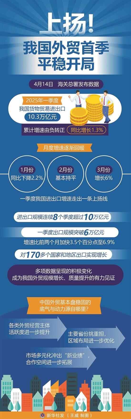 4月14日,海关总署发布一季度进出口数据:货物贸易进出口10.3万亿元人民币,累计增速由负转正,同比(下同)增长1.3%。其中,出口6.13万亿元,增长6.9%;进口4.17万亿元,下降6%。