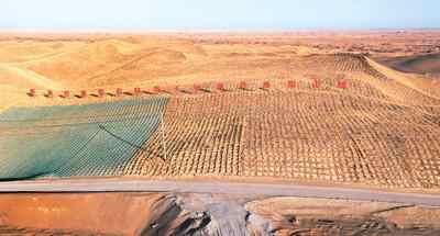 图为新疆维吾尔自治区和田地区民丰县锁边林草带。