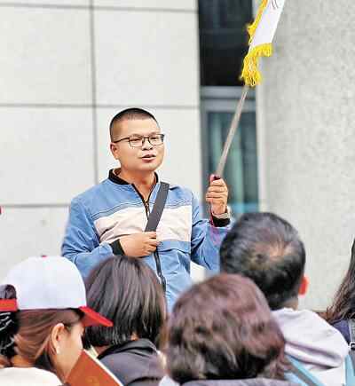 图为4月13日,陈飞碟在河口口岸为越南旅游团游客介绍中国风土人情。吕子龙摄(人民视觉)