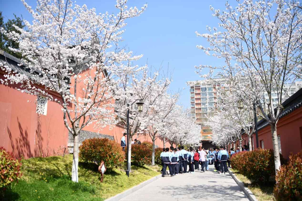 芳菲四月,春光正好。宿迁市钟吾初级中学校园东南角的孔庙,迎来了一年中最动人的时节。朱红色的大成殿前,两排樱花树开得正盛,粉白花瓣随风飘落在青砖地面上。