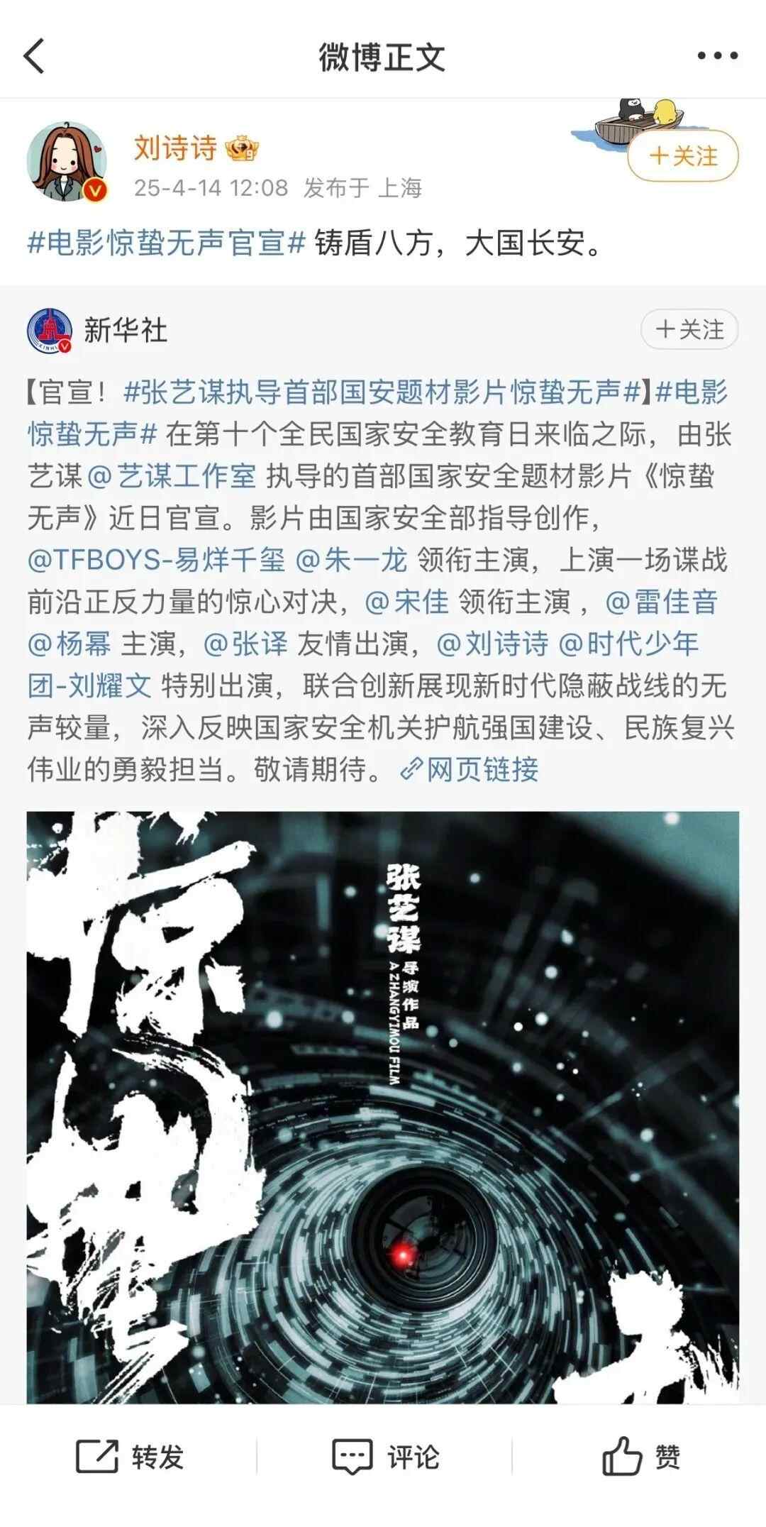4月14日,我国首部聚焦当代国家安全题材的影片《惊蛰无声》官宣并发布首张概念海报。