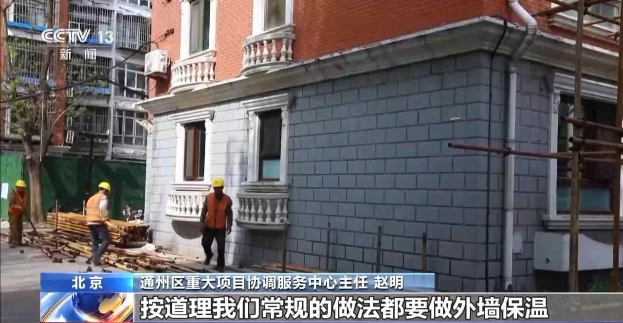 北京市通州区重大项目协调服务中心主任 赵明:前面那栋楼外墙在改造,按道理,我们常规的做法都要做外墙保温。这两栋楼,老百姓认为我的外墙瓷砖有保温,我就不需要再做这事了。