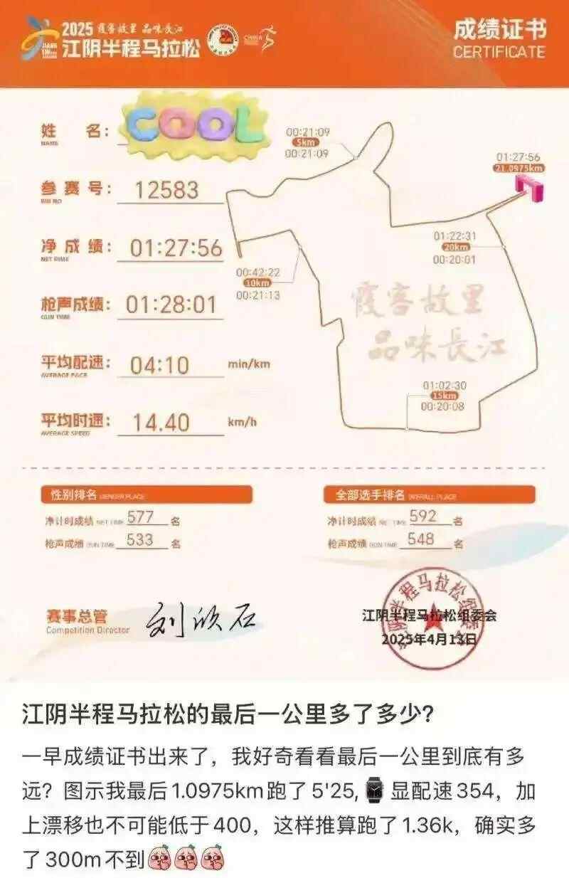 此前,据扬子晚报消息,近日,多位跑友在社交平台上反映,称今年4月13日举办的江阴半程马拉松最后一公里存在距离超标问题。“手表显示我最后1.0975公里的配速是3分53秒,但跑完最后这段路实际用时5分钟26秒”“第二天我去复盘的,从20公里计时点到终点显示是1.36公里”“最后一公里明明加速了,但用时更长”,还有跑友爆料称,这次官方安排的部分配速员都没能按时完赛。