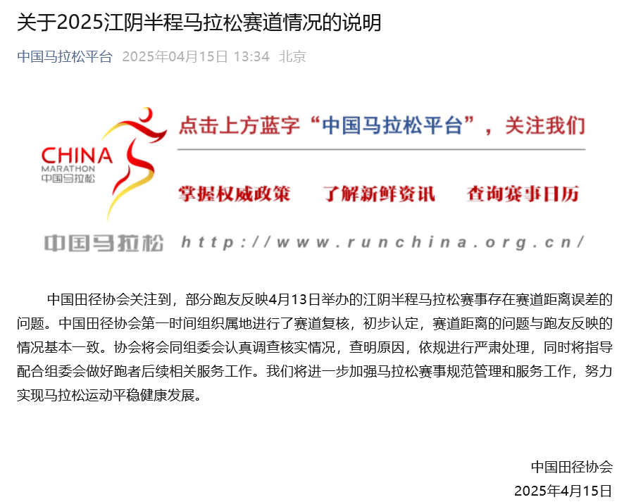 中国田径协会关注到,部分跑友反映4月13日举办的江阴半程马拉松赛事存在赛道距离误差的问题。中国田径协会第一时间组织属地进行了赛道复核,初步认定,赛道距离的问题与跑友反映的情况基本一致。协会将会同组委会认真调查核实情况,查明原因,依规进行严肃处理,同时将指导配合组委会做好跑者后续相关服务工作。我们将进一步加强马拉松赛事规范管理和服务工作,努力实现马拉松运动平稳健康发展。