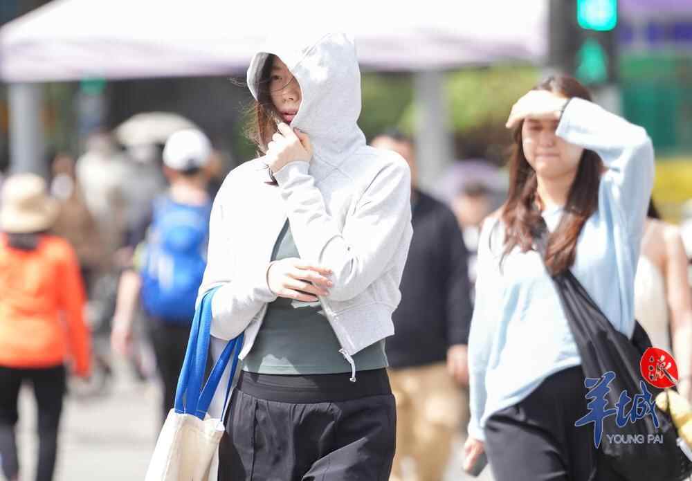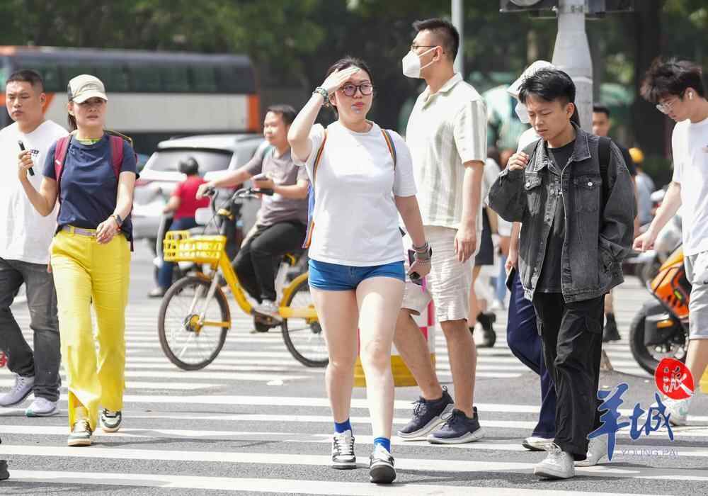 正午时分的广州,不少市民在阳光中身穿夏装出行。4月15日的广州国家基本气象站最高气温达33.3℃。