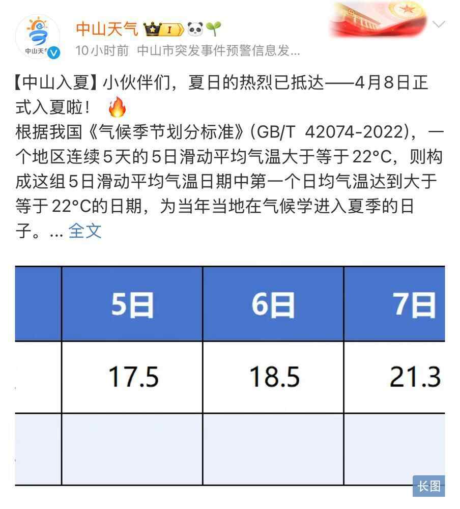 在深圳官宣入夏的同一天,中山市气象局也宣布,从4月10日至4月14日,中山市连续5天的5日滑动平均气温均≥22℃;构成4月10日的5日滑动平均气温中,4月8日的日平均气温达到22.7℃,所以4月8日为2025年中山进入夏季的日子。