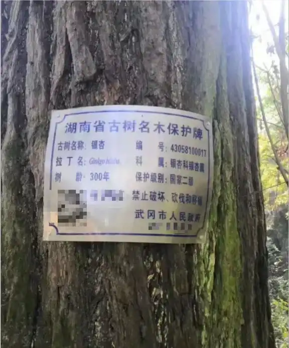 根据上述学生提供的照片,被砍伐银杏树树身上挂有“湖南省古树名木保护牌”,保护牌显示其编号为43058100017,树龄为300年,保护级别为国家二级。