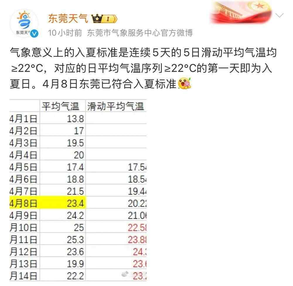 此外,东莞也在4月15日官宣4月8日为“入夏日”。
