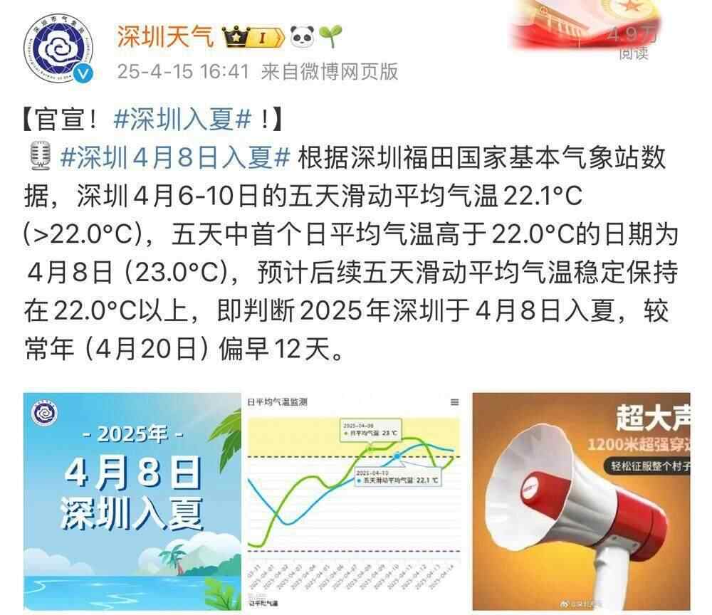 深圳市气象局4月15日宣布,根据深圳福田国家基本气象站数据,深圳4月6日-10日的五天滑动平均气温22.1℃(>22.0℃),五天中首个日平均气温高于22.0℃的日期为4月8日(23.0℃),预计后续五天滑动平均气温稳定保持在22.0℃以上,判断2025年深圳于4月8日入夏,较常年(4月20日)偏早12天。