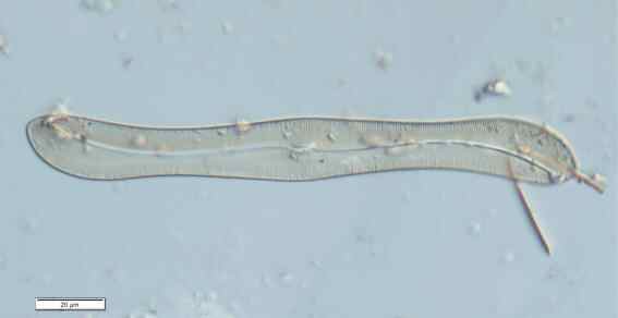 这是一种附着或底栖性硅藻,其结构非常独特,藻体略呈“S”形,壳面中部宽,两端变窄,末端膨大略呈刀状,表面横纵纹交错成网格状,长度可达218微米,主要栖息于河口微咸水生境,对环境变化高度敏感。