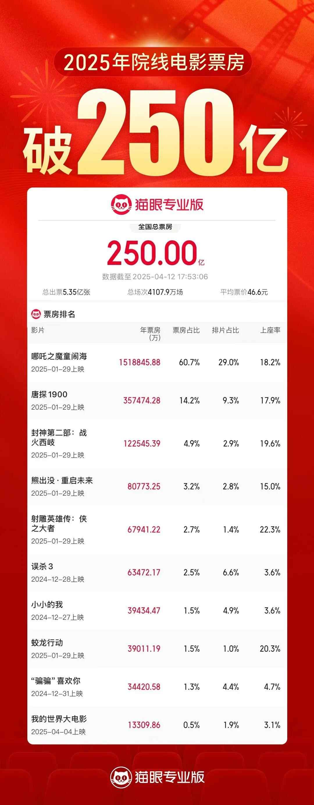 据网络平台数据,截至4月12日17时38分,2025年度大盘票房(含预售)已突破250亿元,居全球第一。《哪吒之魔童闹海》跻身全球影史票房前五。
