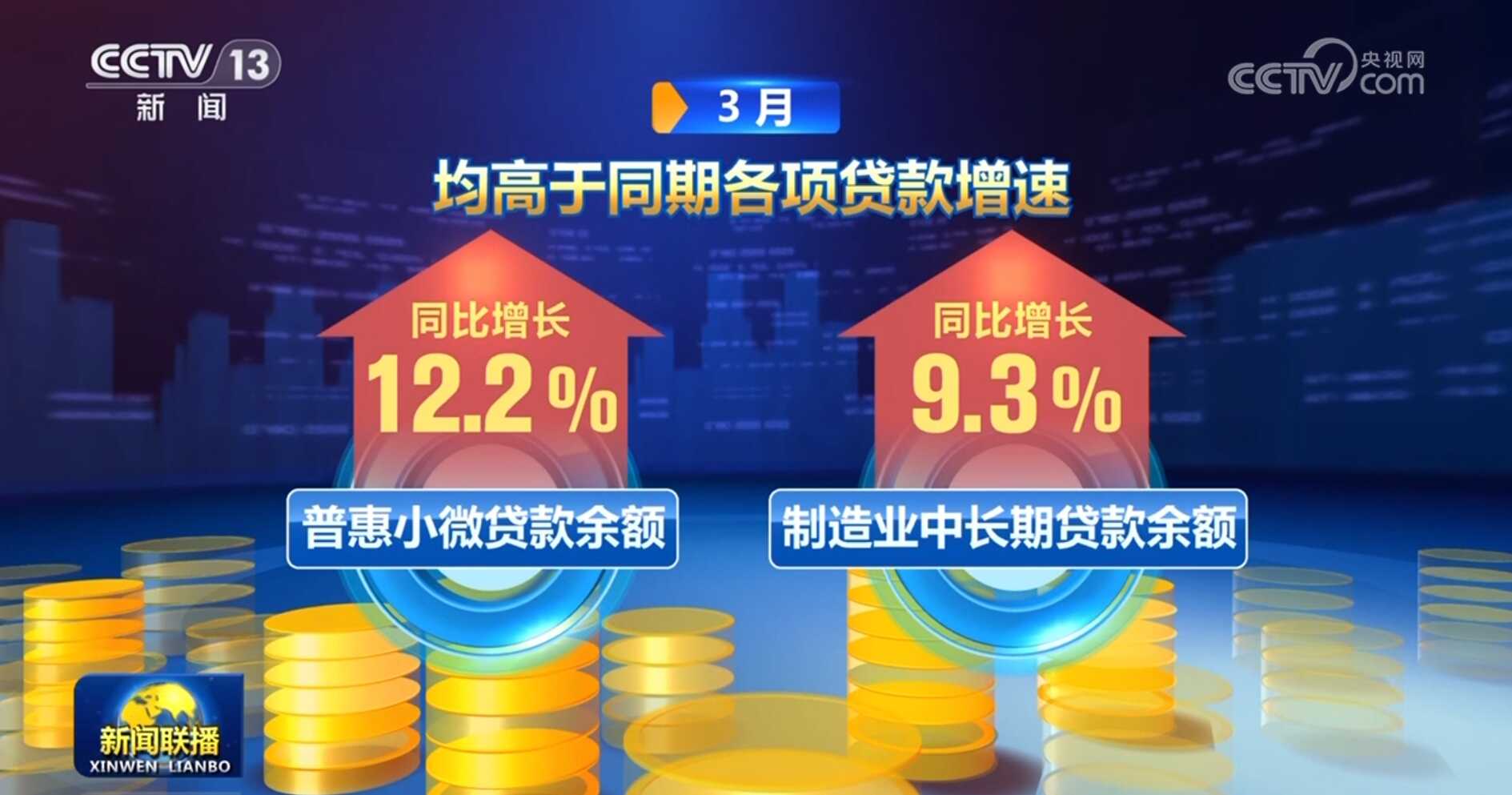 贷款同比多增,信贷结构也出现不少亮点。3月,普惠小微贷款余额、制造业中长期贷款余额分别同比增长12.2%、9.3%,均高于同期各项贷款增速。