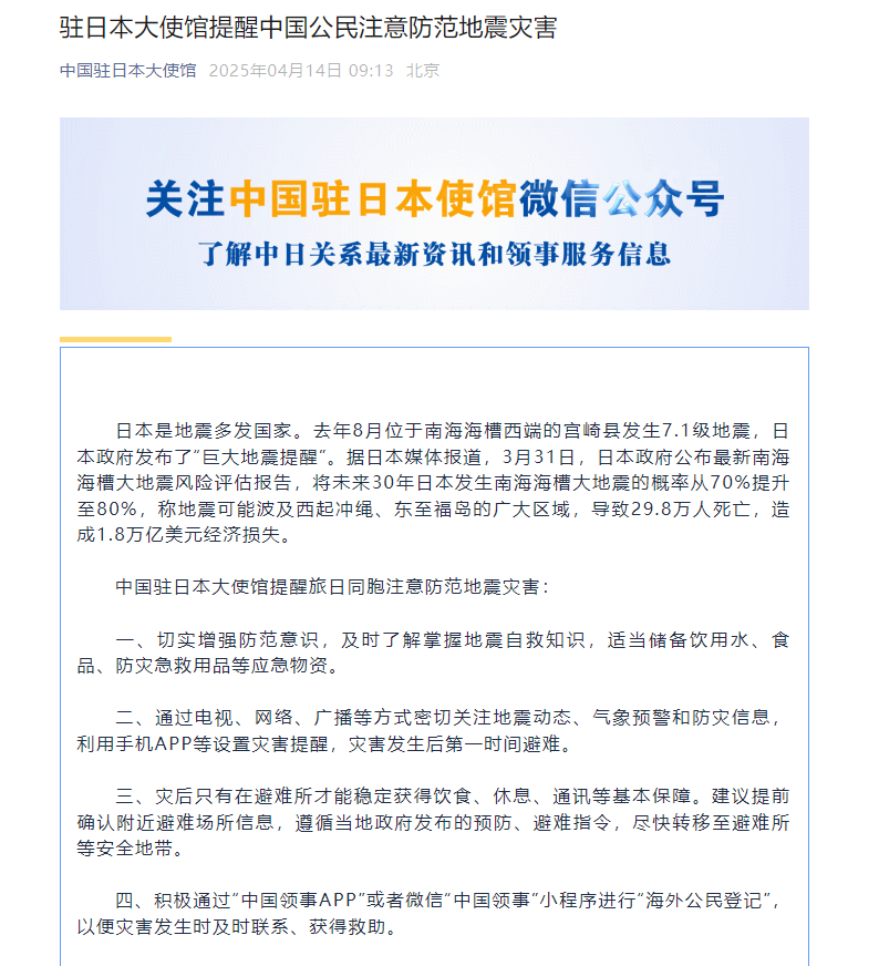 中国驻日本大使馆提醒旅日同胞注意防范地震灾害: