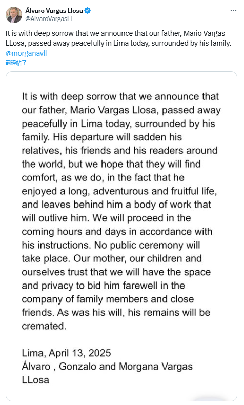 略萨的儿子阿尔瓦罗·巴尔加斯·略萨在社交媒体X上分享的家庭声明中表示:“我们怀着沉重的心情宣布,我们的父亲马里奥·巴尔加斯·略萨今天在利马安详去世,身边陪伴着家人。”这位作家的三个孩子补充说,不会举行公众仪式,但他们将进行家庭告别。