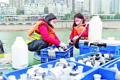 生态环境部门工作人员正在长江边进行水样采集。资料图片