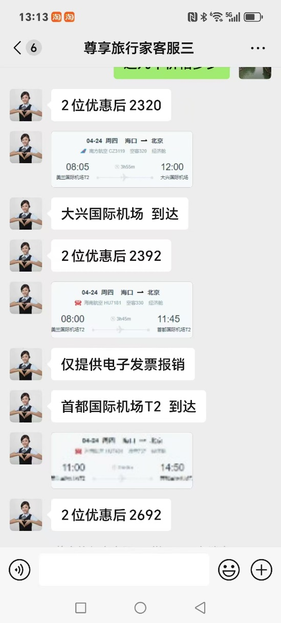 以石女士和老伴从海口飞北京的票价为例,使用“尊享卡”内的100元后,销售方给出的票价是飞北京大兴机场,两人票价优惠后是2320元。即便是优惠后的价格,单张票价也比航司官网票价高60元。