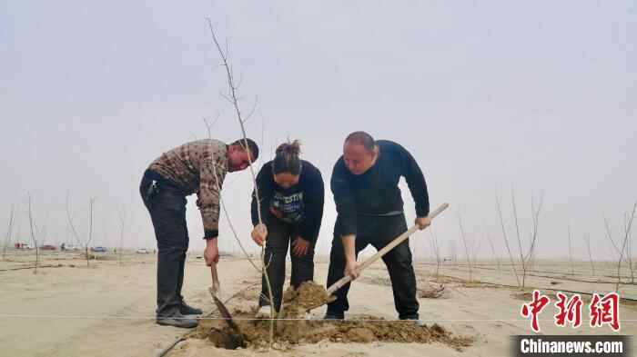 中新网新疆和田4月8日电 (陶拴科)8日清晨,在新疆和田县巴格其镇经济林种植带,村民艾克禾·买提克然给新栽的沙枣苗培土。他身后,去年还是一座座沙丘的地方如今已经变成平整良田,嫩绿的树苗在春风里轻轻摇晃。