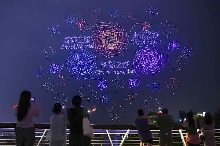2024年9月26日,市民、游客在深圳湾观看广东深圳大漠大智控技术有限公司呈现的无人机编队表演。新华社记者 梁旭 摄