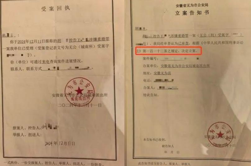 2024年12月11日,安徽省无为市公安局城南派出所受理了胡女士控告王某涉嫌重婚罪一案。