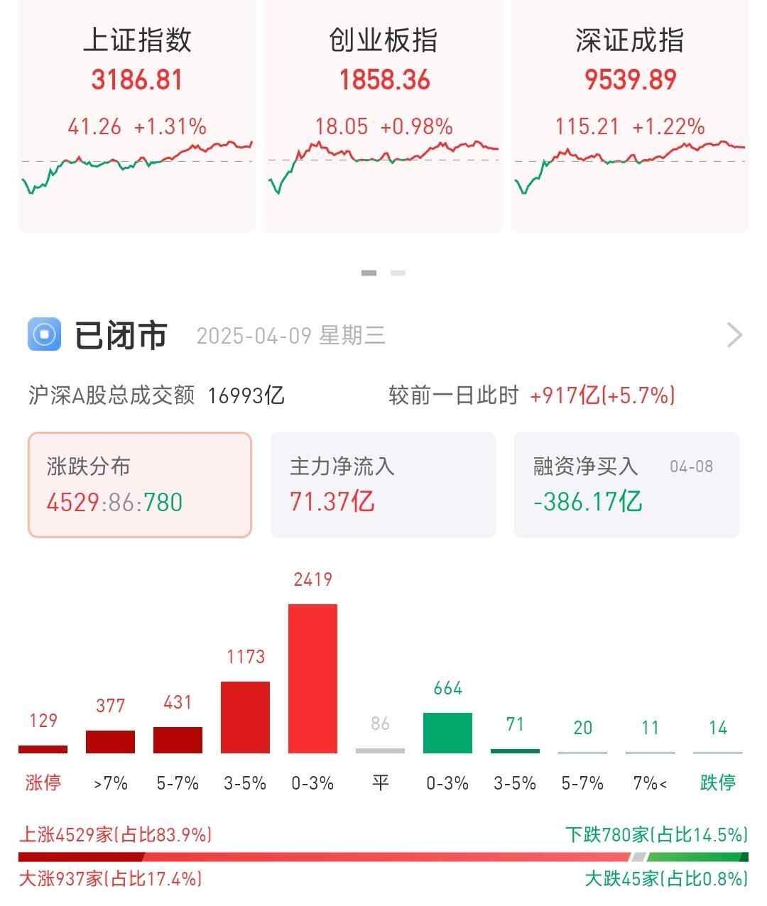 4月9日,A股三大指数集体上涨,截至收盘, 上证指数收涨1.31%,深证成指收涨1.22%,创业板指收涨0.98%;北证50收涨10.27%。两市成交额约16996.05亿元,较前一个交易日放量约739.62亿元。全市场4529只股票上涨、780只股票下跌。