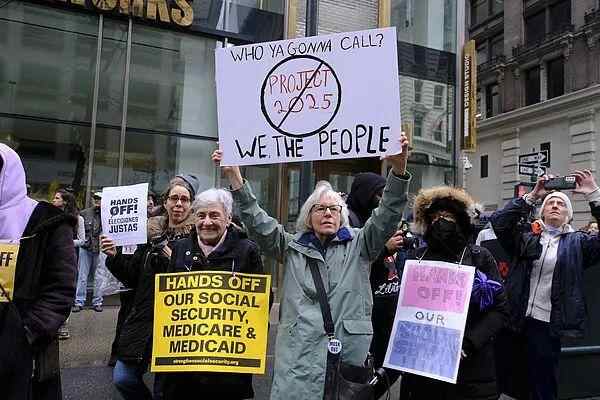 2025年4月5日,美国纽约,抗议民众高呼“住手”。图源:视觉中国
