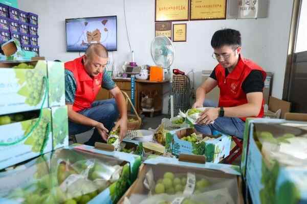 在浙江省诸暨市姚江镇,“姚小二”党员志愿服务队在“葡之梦”共富工坊中帮助农户将采摘下来的葡萄分拣装箱、打包发货
