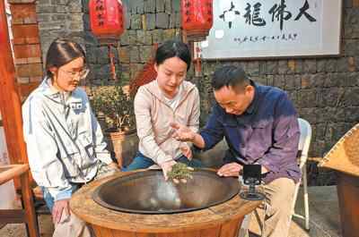 浙江绍兴新昌县回山镇,游客在手工炒茶师傅指导下体验炒茶。
