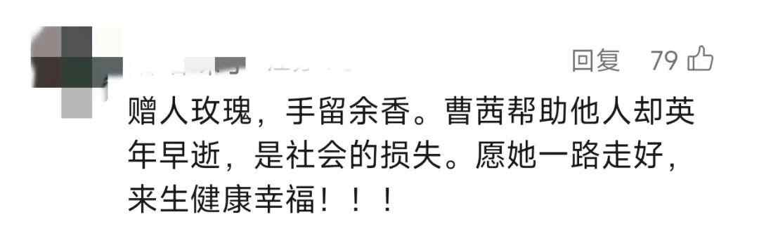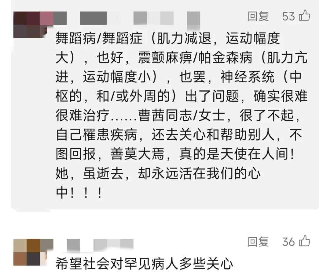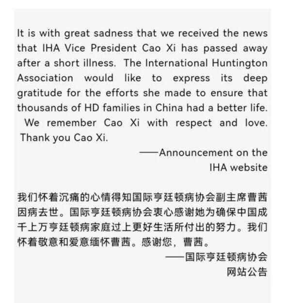 上海浦东风信子亨廷顿舞蹈症关爱中心发布的讣告写道:曹茜女士一生善良、乐观,热心助人。她不仅是我们风信子关爱中心的灵魂人物,更是中国亨廷顿舞蹈症群体心中的灯塔。