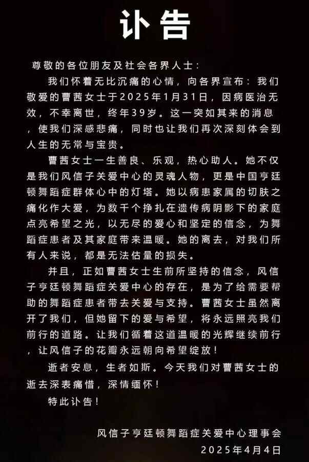 近日,上海浦东风信子亨廷顿舞蹈症关爱中心发布讣告:风信子创始人曹茜女士于2025年1月31日,因病医治无效,不幸离世,终年39岁。