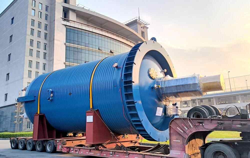 2024年1月3日,岷江实业集团生产的大型化工设备运输出厂。(受访者供图)