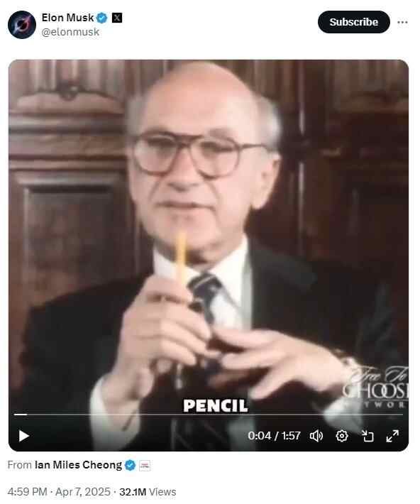 与此同时,4月7日,马斯克在其社交媒体账号上分享了一段已故经济学家米尔顿·弗里德曼的视频,视频中弗里德曼通过分析制造一支简单木制铅笔的材料来源,解释了国际贸易合作的好处(上图)。