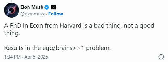 马斯克此前还曾公开批评特朗普的首席贸易顾问、关税支持者纳瓦罗。4月5日,他在社交平台“X”上表示纳瓦罗拥有哈佛大学经济学博士学位是件坏事,这会导致人们因自负而缺乏智慧。在4月5日线上出席意大利佛罗伦萨举行的政党活动时,马斯克又呼吁欧洲和美国应该走向零关税,从而有效地在跨大西洋之间建立自由贸易区,同时也促进人员流动。