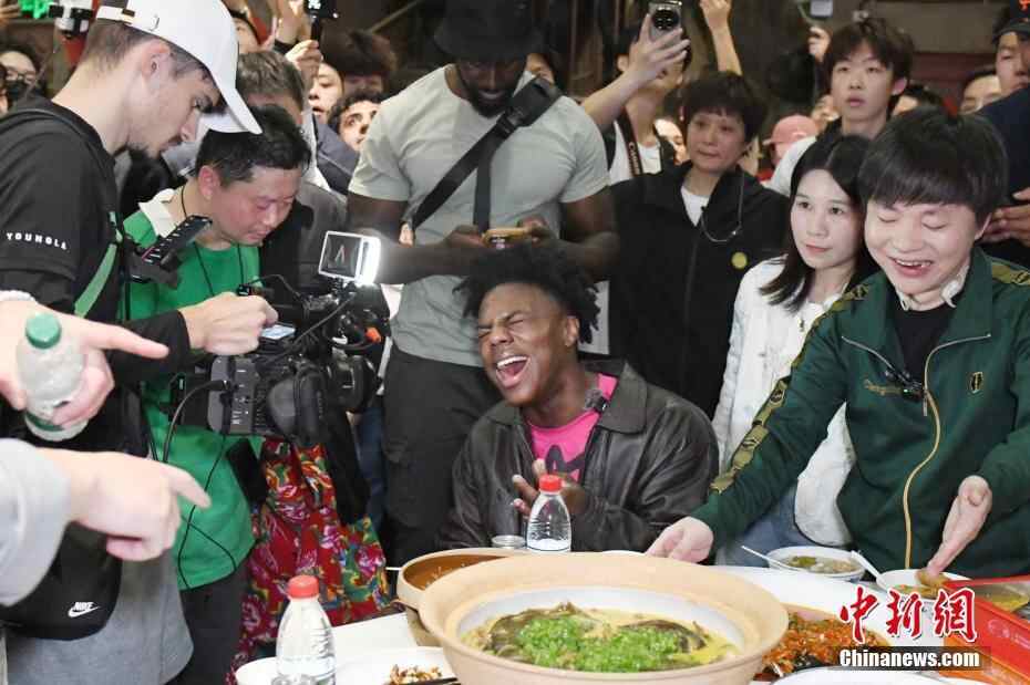 4月7日,“甲亢哥”直播开启长沙行。当晚,他现身长沙超级文和友,品尝了地道湘味美食,糖油粑粑、麻辣牛蛙、长沙臭豆腐等等,还被湖南美食剁椒鱼头辣到满头冒汗,网友:“这次得让你感受一下长沙辣度!”