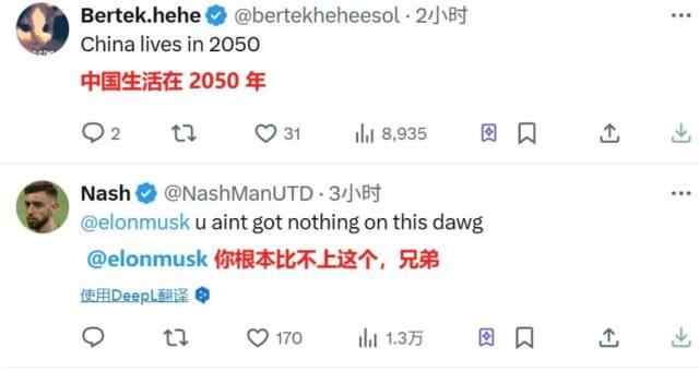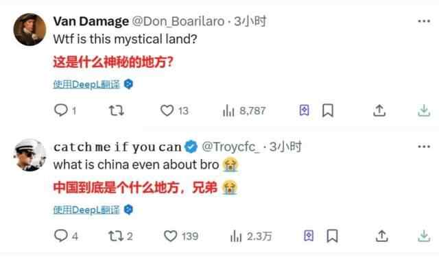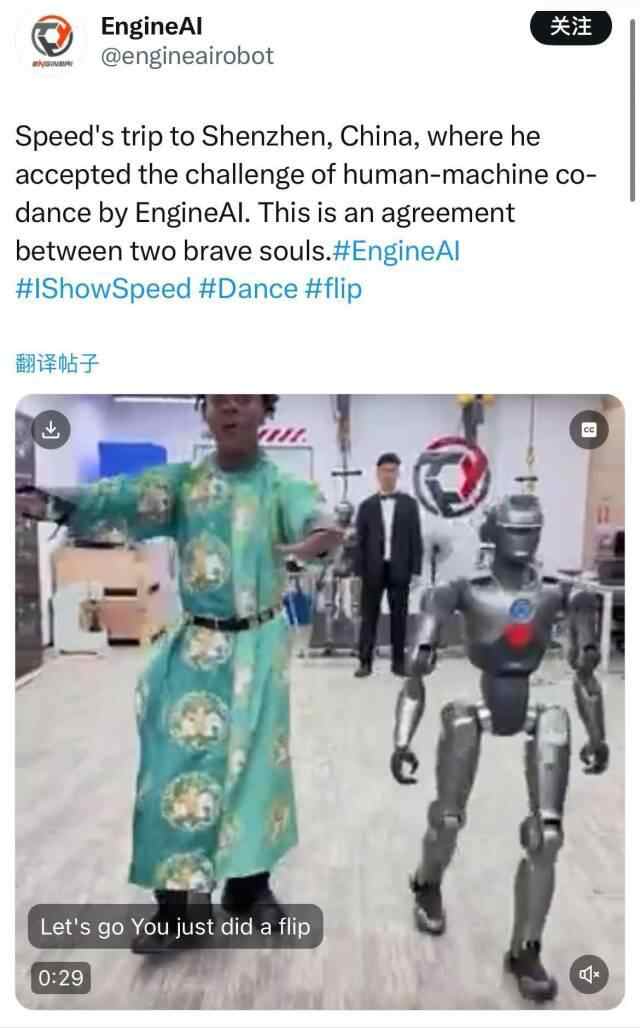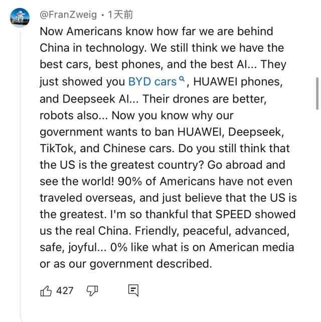 “现在美国人知道我们在技术上落后于中国有多远。我们仍然认为我们拥有最好的汽车、最好的手机…而他们刚刚给你看了比亚迪汽车,华为手机,和DeepseekAI……他们的无人机更好,机器人也更好……现在你知道为什么我们的政府想禁止华为、Deepseek、抖音和中国汽车了。你仍然认为美国是最伟大的国家吗?出国看看世界!90%的美国人甚至没有出国旅行过,只是相信美国是最伟大的。我非常感谢Speed向我们展示了真正的中国。友好、和平、先进、安全、快乐……0%像美国媒体或我们政府描述的那样。”