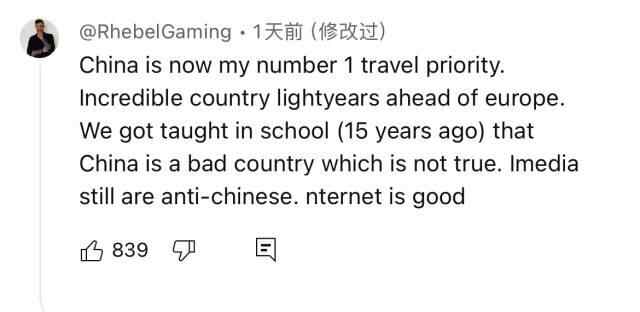 “中国现在是我的旅行首选国家,这个不可思议的国家比欧洲领先好几光年。我们曾在学校里学到中国是一个坏国家,这是不正确的。”