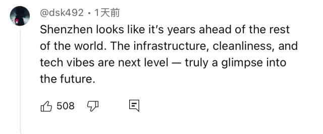 “深圳看起来比世界其他地区领先很多年。基础设施、清洁和技术氛围是另一个水平了,真正对未来的一瞥。”