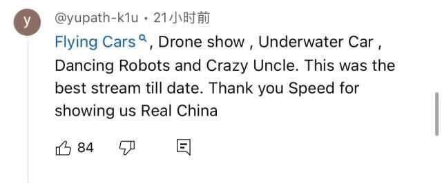 “飞行汽车,无人机表演,水下汽车,跳舞的机器人和疯狂的叔叔。这是迄今为止最好的流媒体视频。感谢Speed向我们展示了真正的中国。”