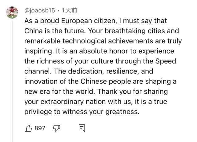 “作为一个骄傲的欧洲公民,我必须说中国是未来。你们令人叹为观止的城市和非凡的技术成就确实令人鼓舞。能通过Speed频道体验你们文化的丰富性是绝对的荣幸。中国人民的奉献精神、韧性和创新正在为世界塑造一个新时代。感谢与我们分享非凡的国家,见证你的伟大是真正的荣幸。”