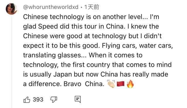 “中国的技术处于另一个层面…我很高兴Speed在中国进行了这次旅行。我知道中国人擅长技术,但我没想到会这么好。飞行汽车、水上汽车、翻译眼镜…说到技术,首先想到的国家通常是日本,但现在中国真的做出了改变。太棒了,中国。”