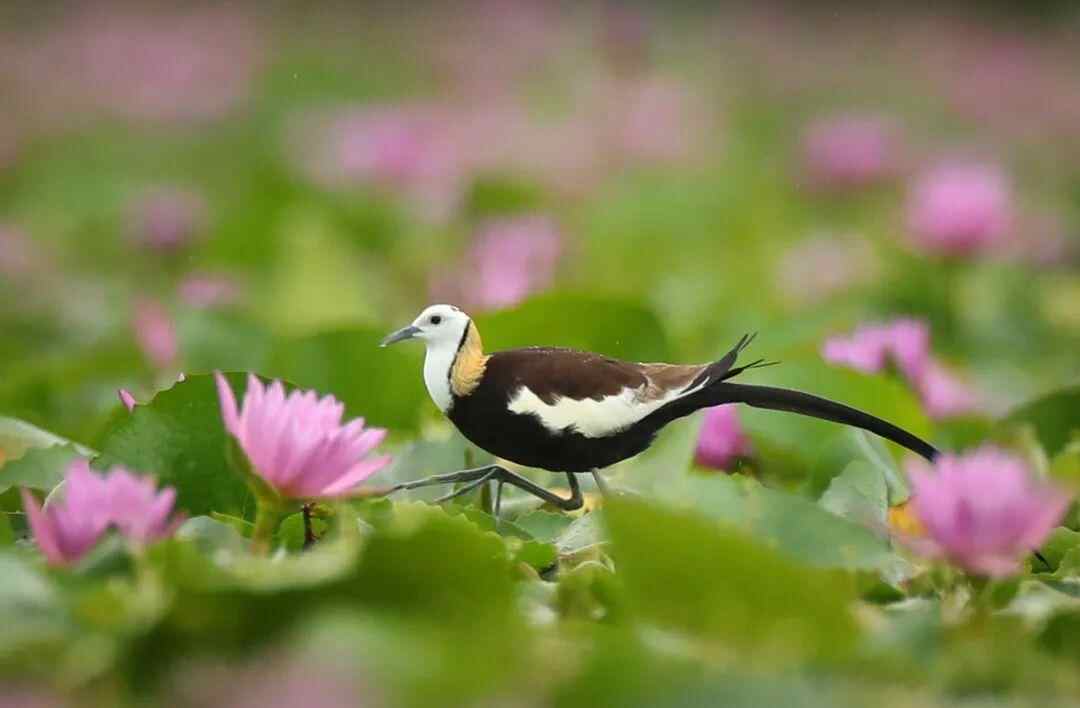 陈杰介绍,龙庆村环境优美,为水雉等鸟类提供了稳定的栖息地,5月至7月为最佳拍鸟期。这些披着金黄繁殖羽的精灵,轻步于粉、紫、黄等各色睡莲间觅食、求偶,其细长的脚爪能轻步行走于荷叶上,体态优美,姿态翩翩。