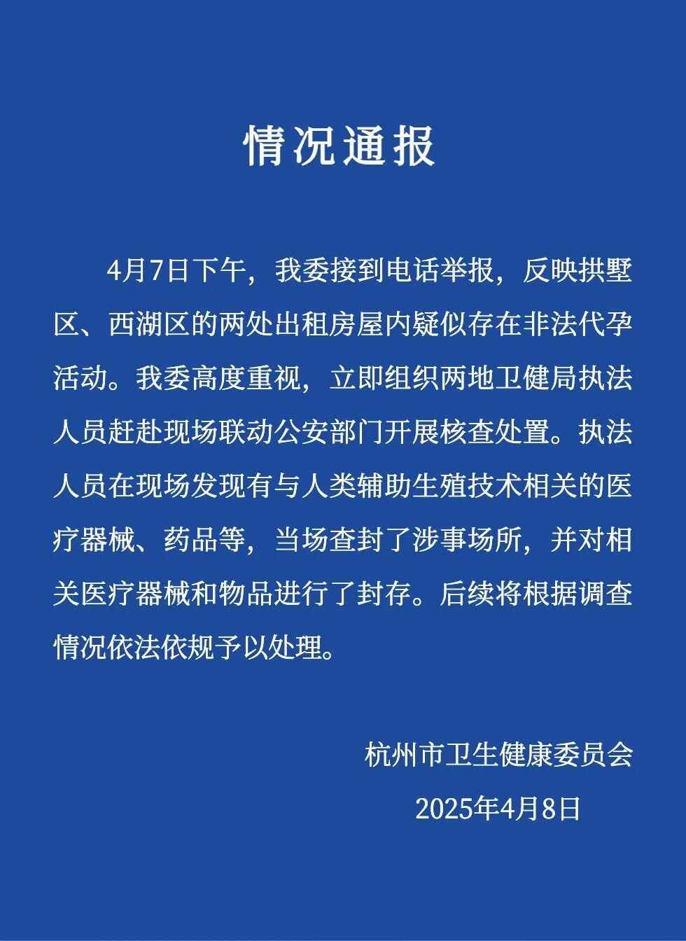 4月8日,杭州卫健委通报拱墅区、西湖区的两处出租房屋内疑似存在非法代孕活动。详情如下。