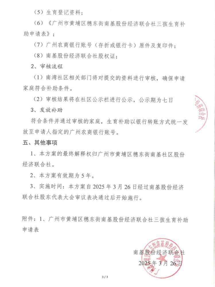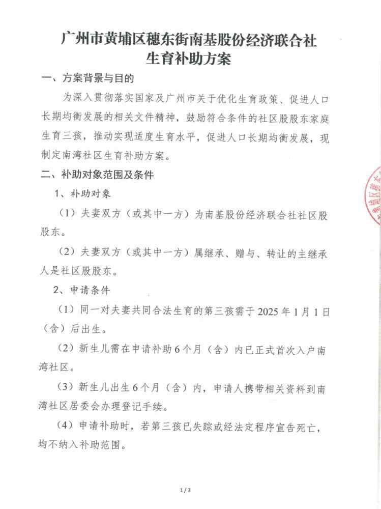 近日,广州黄埔区南湾社区召开党员大会和南基股份经济联合社股东代表大会,审议通过《广州市黄埔区穗东街南基股份经济联合社生育补助方案》(以下简称“方案”),明确规定符合条件的家庭生育三孩可一次性申领50000元生育补助金。