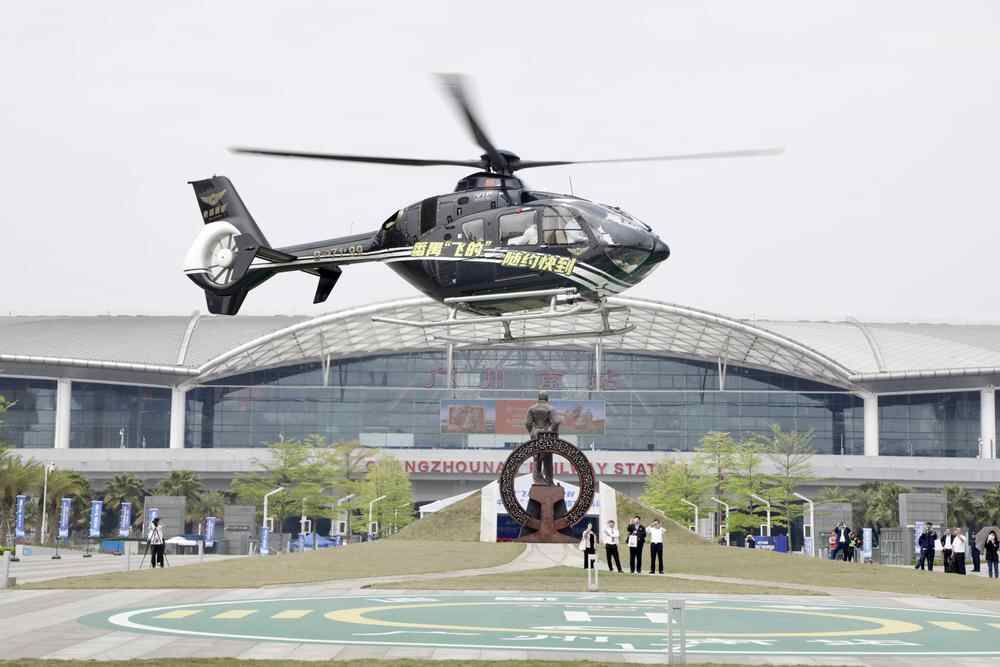 一架直升机从广州南站詹天佑广场盘旋上升,载着体验嘉宾跨越广州大学城,最后缓缓降落在南沙港码头,这是番禺“空中的士”快速出行网络发布活动的体验场景。
