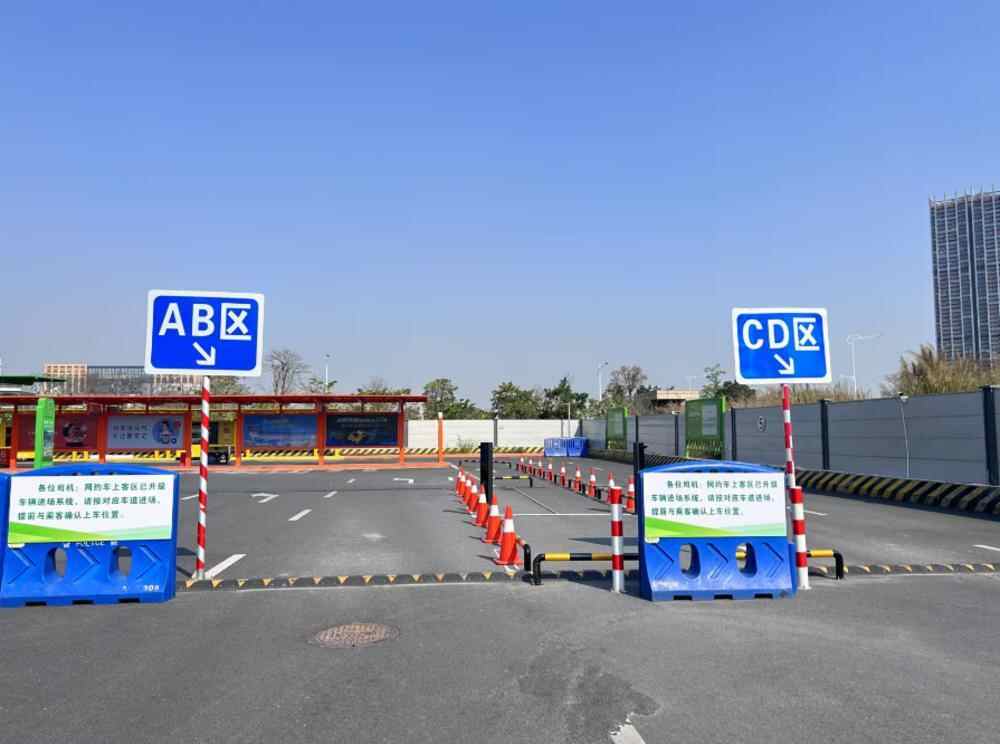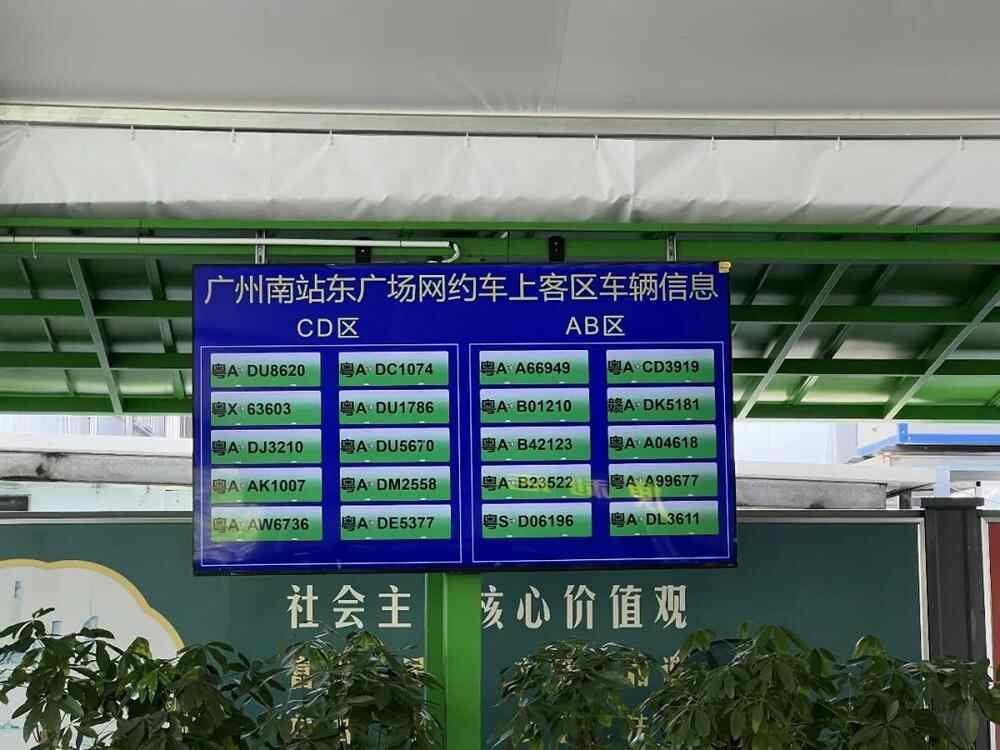 在广州南汽车站东广场网约车上客区,网约车进场后,车牌会显示在候乘区的电子屏幕上,电子屏幕分为AB区和CD区,乘客根据车牌可以直观获取车辆位置信息,到对应区域快速找到车,有效减少寻车时间。